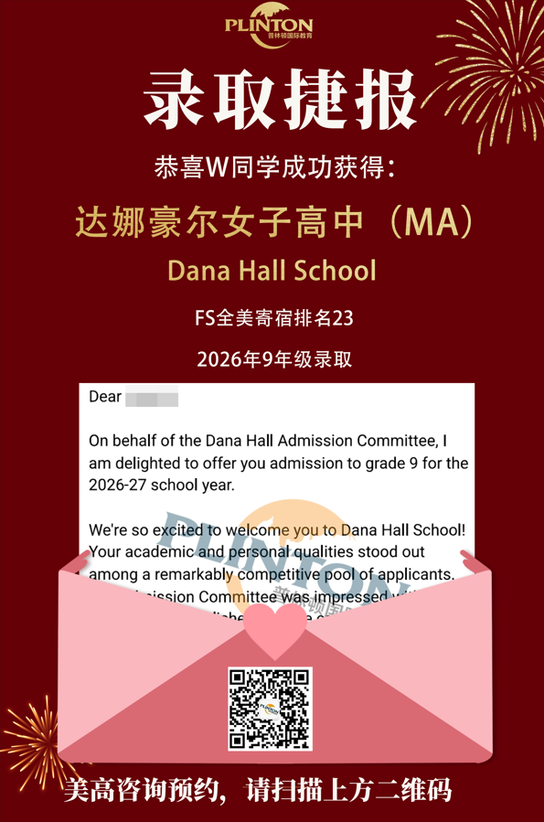 恭喜普林顿教育W同学获得顶尖寄宿Dana Hall School达娜豪尔女子高中9年级offer!